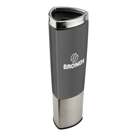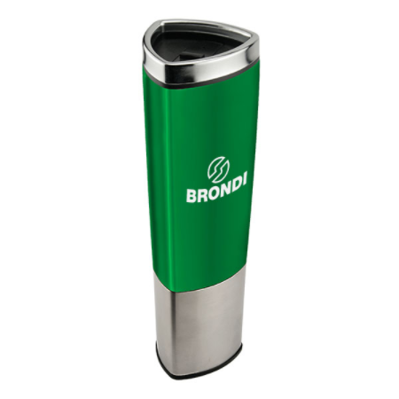 Have new and potential clients grinding to a halt at your tradeshow booth when you advertise on this 16 oz. Triangle Travel Tumbler! It features a contoured base with non-skid bottom and fits in most cup holders. It measures 9 1/2" x 2 3/4" x 2 3/4" and has a triangular shape. The stainless steel base and lid add an attractive flair and you can add a three-sided one color identical imprint to rev up the style even more. It's a great promotional tool for grand openings, car shows and more!