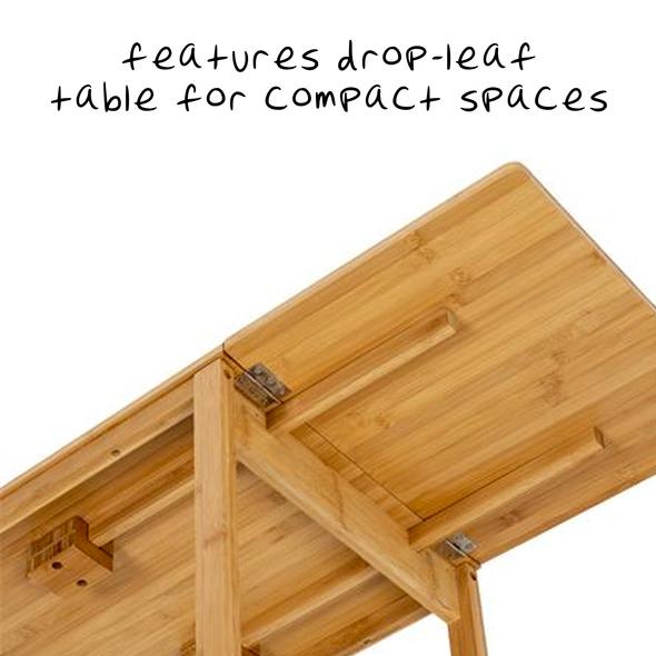 • Dimensions: 15”L x 22”W x 38”H (34"W with leaf open)