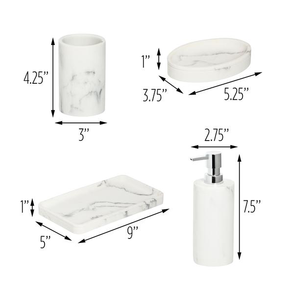 - Includes Toothbrush holder, Soap dispenser, Tray, Soap dish