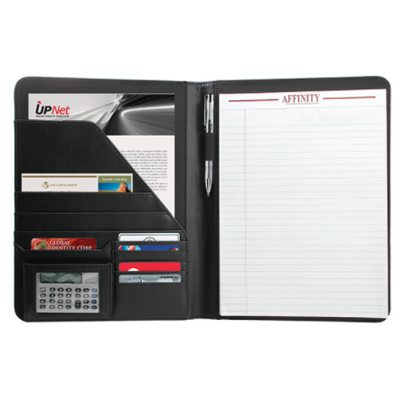 In the market for a product that will prioritize your promotional efforts? Look no further than the Park Avenue Boardroom Desk Folder! Measuring 9 3/4" x 12 3/4" x 5/8" and made from Nappa leatherette material, this handy organizational tool features a padded cover, rich microfiber lining, five card pockets, a pen loop, a CD pocket, a calculator pocket, double-turned French Edge styling and a 50-page ruled writing pad. Customize with an imprint of your brand logo to create a must-have accessory for professionals and students alike.