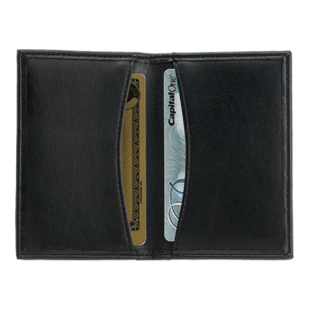 Let your customers know where to find all of the best items when you give them this Senator business card wallet! It measures 4 1/8" x 2.75" x 1/2", comes in black and is made of Rio hide simulated leather. It features an upscale design with two interior pockets that work for anything from credit cards to currency. Hand this out, imprinted with your company name or logo, and give your clients the ability to network in style!