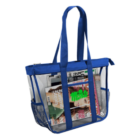 Make your marketing intentions crystal clear during the next campaign by handing out this clear tote bag! Measuring 12" x 16" x 13" and available in several accenting colors, this large, handy bag is made from 0.5 mm heavy-duty 100% PVC with a 600-denier reinforced bottom and matching handles. It features a main zipper compartment, front pockets, a small inside pocket and a side mesh pocket for a water bottle. Customize with an imprint of your brand logo to get a handle on your promotional efforts.