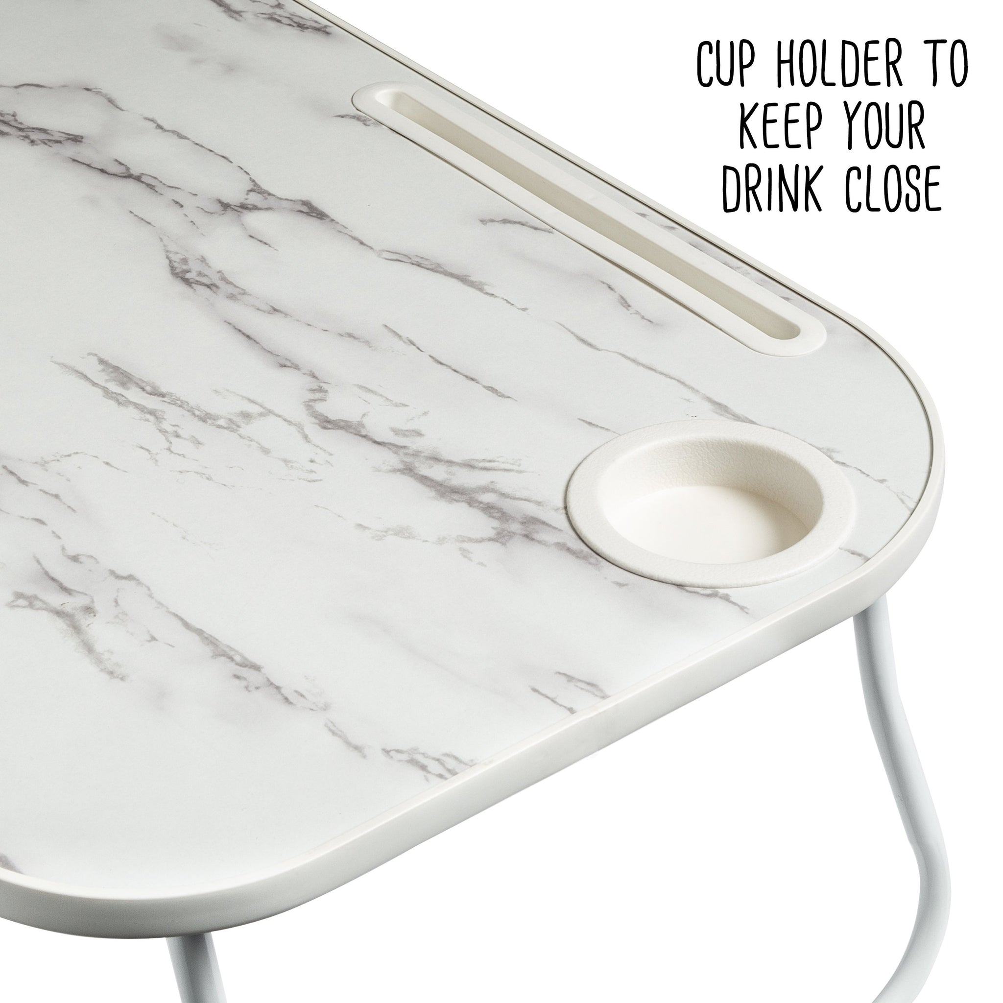 This collapsible lap desk is just what you need to keep you working, burning your creative candle or just lounging, no matter where you are. It features a cup holder and a tablet holder, and its curved cut out lets you bring things up close if necessary. Your laptop will fit neatly on its 24-inch wide surface and the legs collapse to fold up the desk when it’s not in use. Stylish faux white marble finish on top.