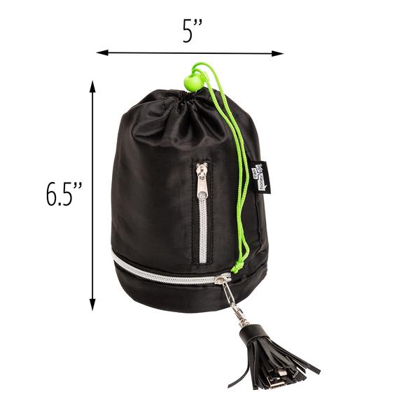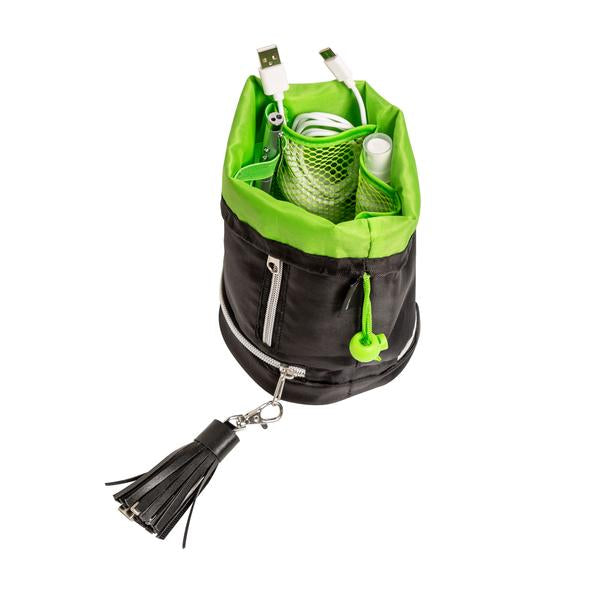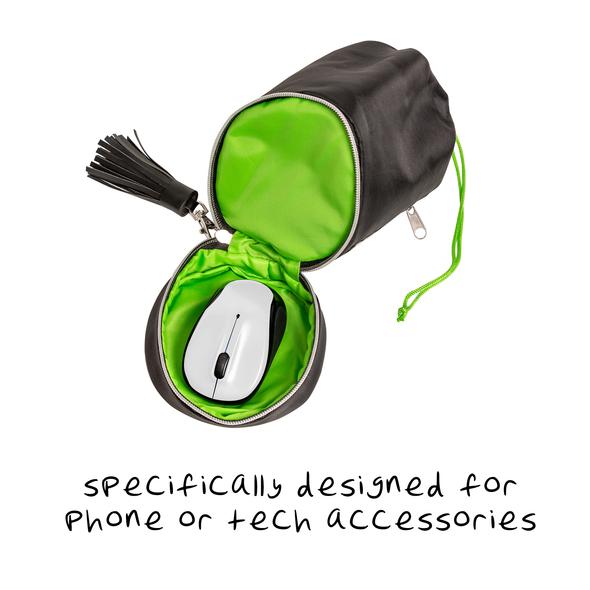 Leave cord tangling and fishing for phone accessories behind with this drawstring pouch phone accessory and cord organizer, designed to organize your tech accessories so you can get to what you need immediately. Also includes 2 adapters, one for charging an Android device and the other for an iPhone.
