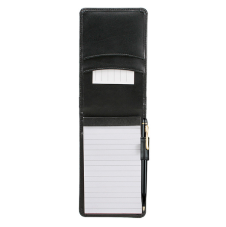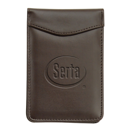 Mark down an outstanding promotional giveaway for your next campaign with the Monte Carlo leather pocket jotter. Measuring 3 3/8" x 5 3/8" x 1/2" and available in black or brown, this handy notepad features an elegantly stitched and padded exterior and fits nicely into your jacket or shirt pocket. It comes with a 3" x 5" paper pad, an elastic pen loop and two pockets for business cards. Customize with an imprint of your company logo and message to create a memorable gift for professionals and students alike.